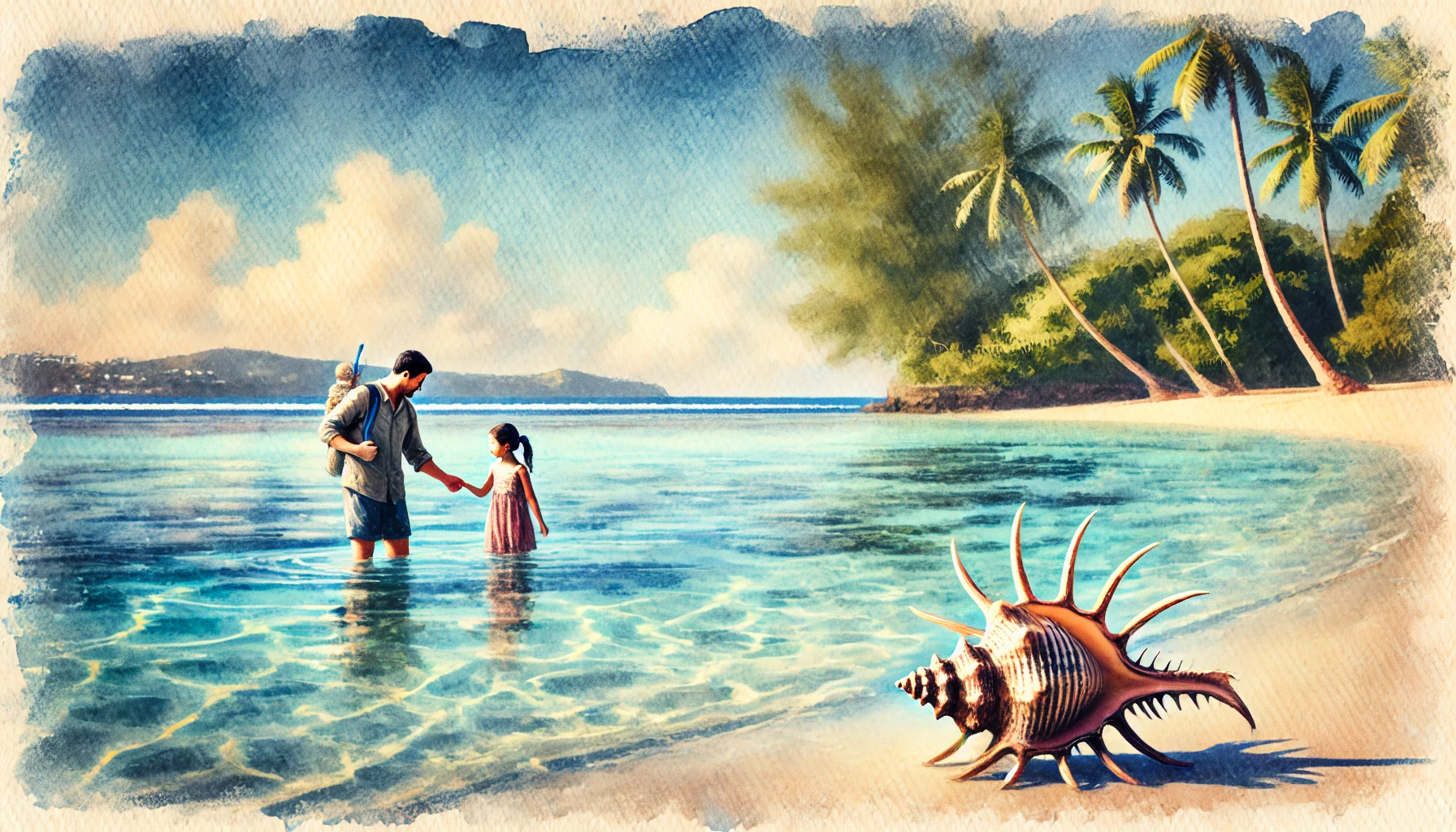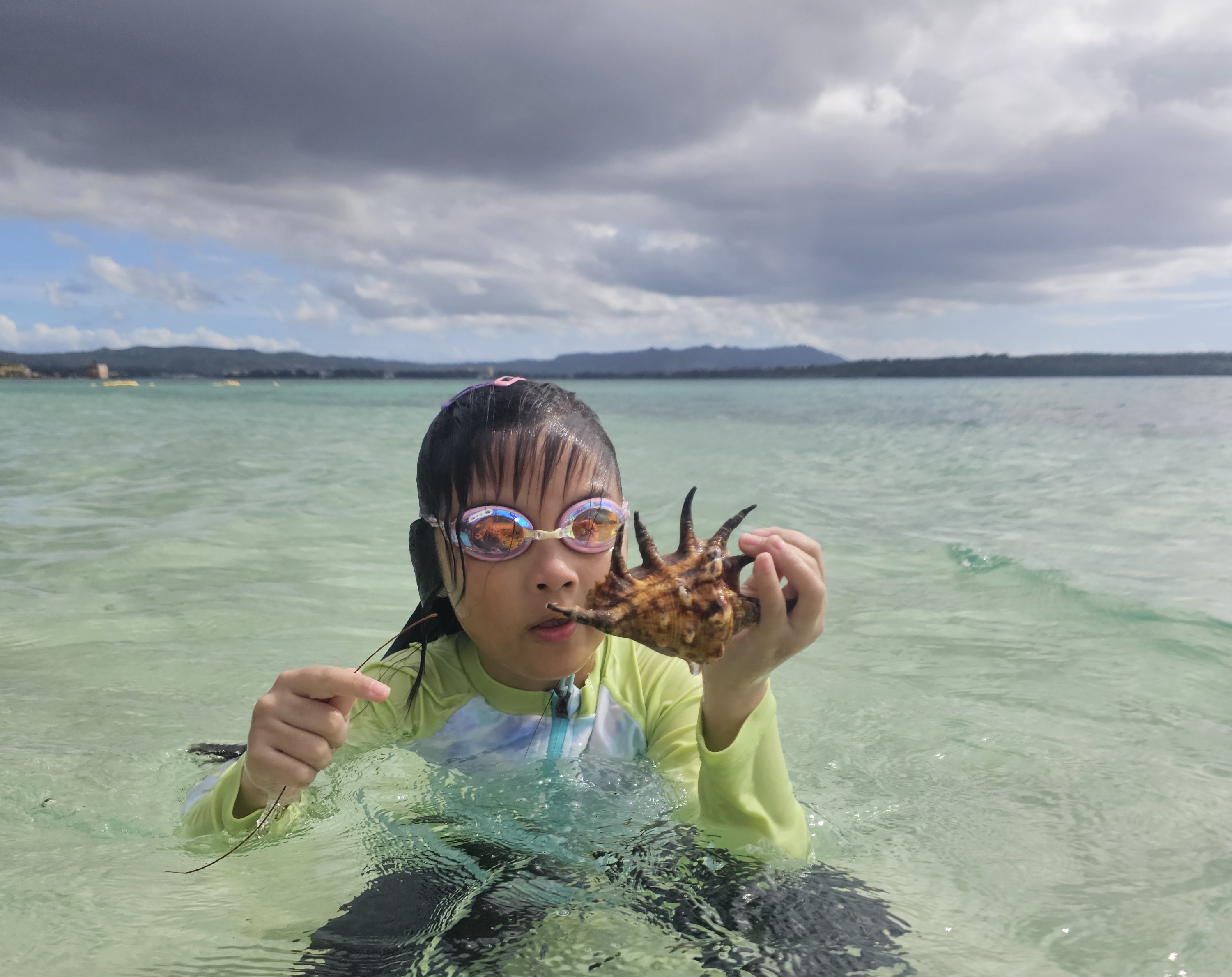 나는 딸이 서 있는 곳에서 잠수를 했다. 바닷속 모래 위에 모래색과 똑같이 생긴 것이 보였다. 껍데기가 뾰족뾰족한 모양을 하고 있었다. 나는 조심스럽게 다가가 그것을 집어 올렸다.